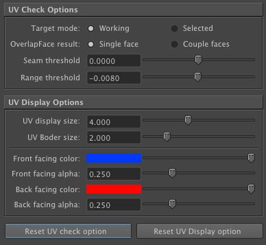 Zero Area UV Check: Check if any uv area of one single face has zero area. It invokes Maya's default method, however it is over reacted. So by default it is off.